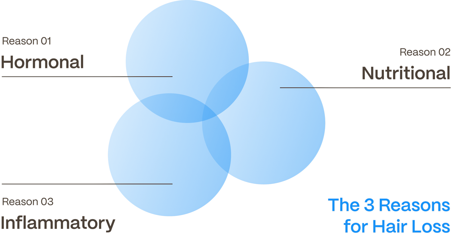 There are three distinct underlying causes of hair loss - Hormonal Hair Loss, Nutritional Hair Loss, and Inflammatory Hair Loss.